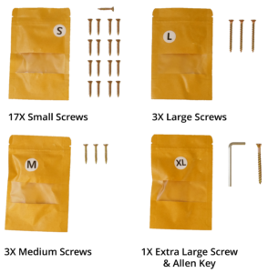 Use the image and the screw inventory list to ensure you have the correct number of each size of screw.